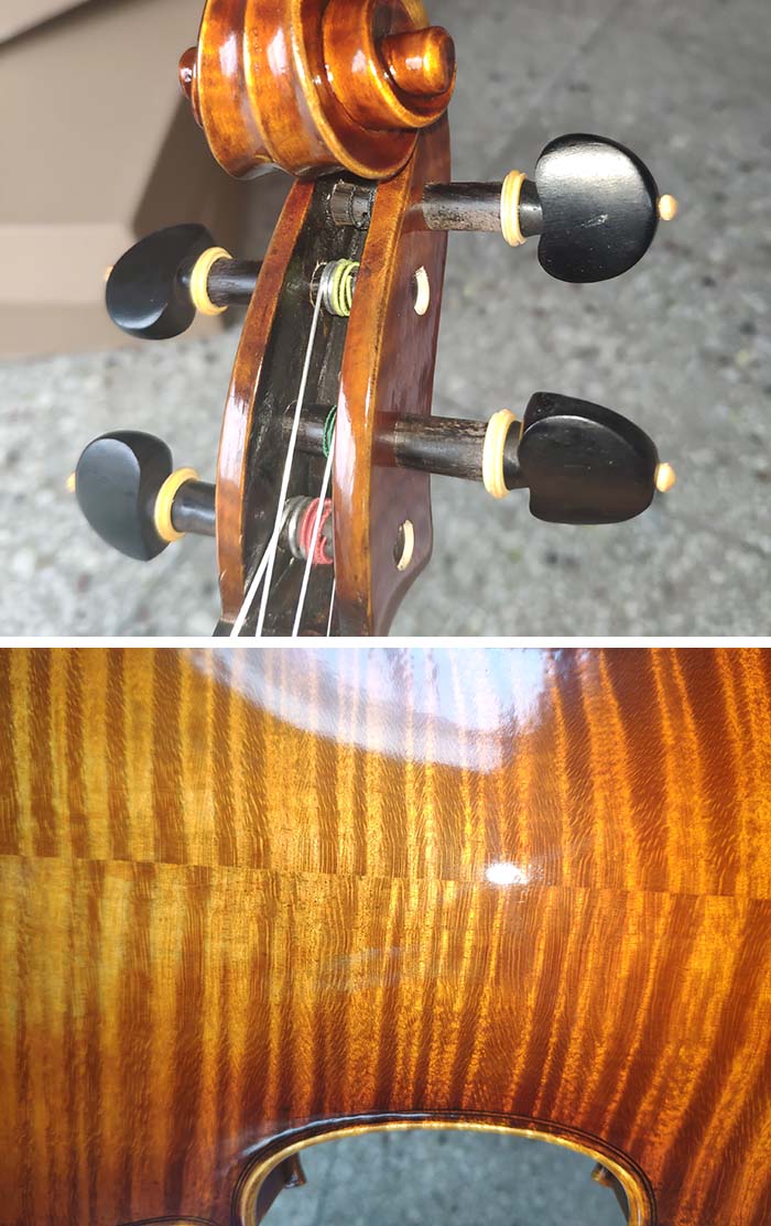 描述:這把琴背板采用的是加拿大楓木,面板為瑞士進口云杉木,木質都是比較均勻的那種,選材非常講究。油漆顏色偏紅偏暗,有輕微的仿舊處理,音質也是相當的棒,可以說是標準的演奏級別小提琴,大家如果喜歡歡迎隨時留言給我。
